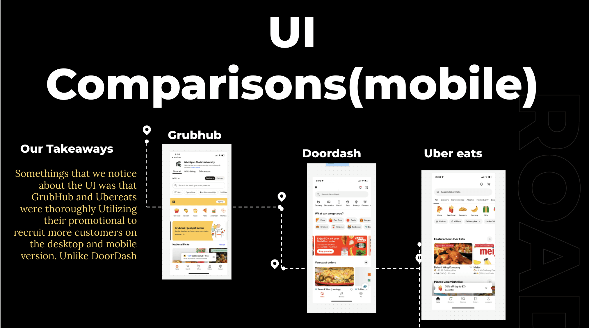 Analyzed the three platforms through heuristic evaluations and landscape analysis. My work focused on identifying usability strengths and weaknesses, highlighting opportunities to improve navigation and accessibility. By breaking down how each service structures information, we created a clearer picture of the overall user experience across the food delivery industry.